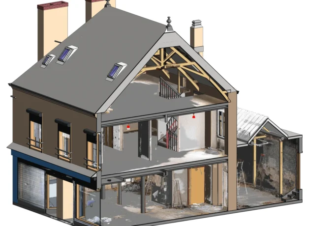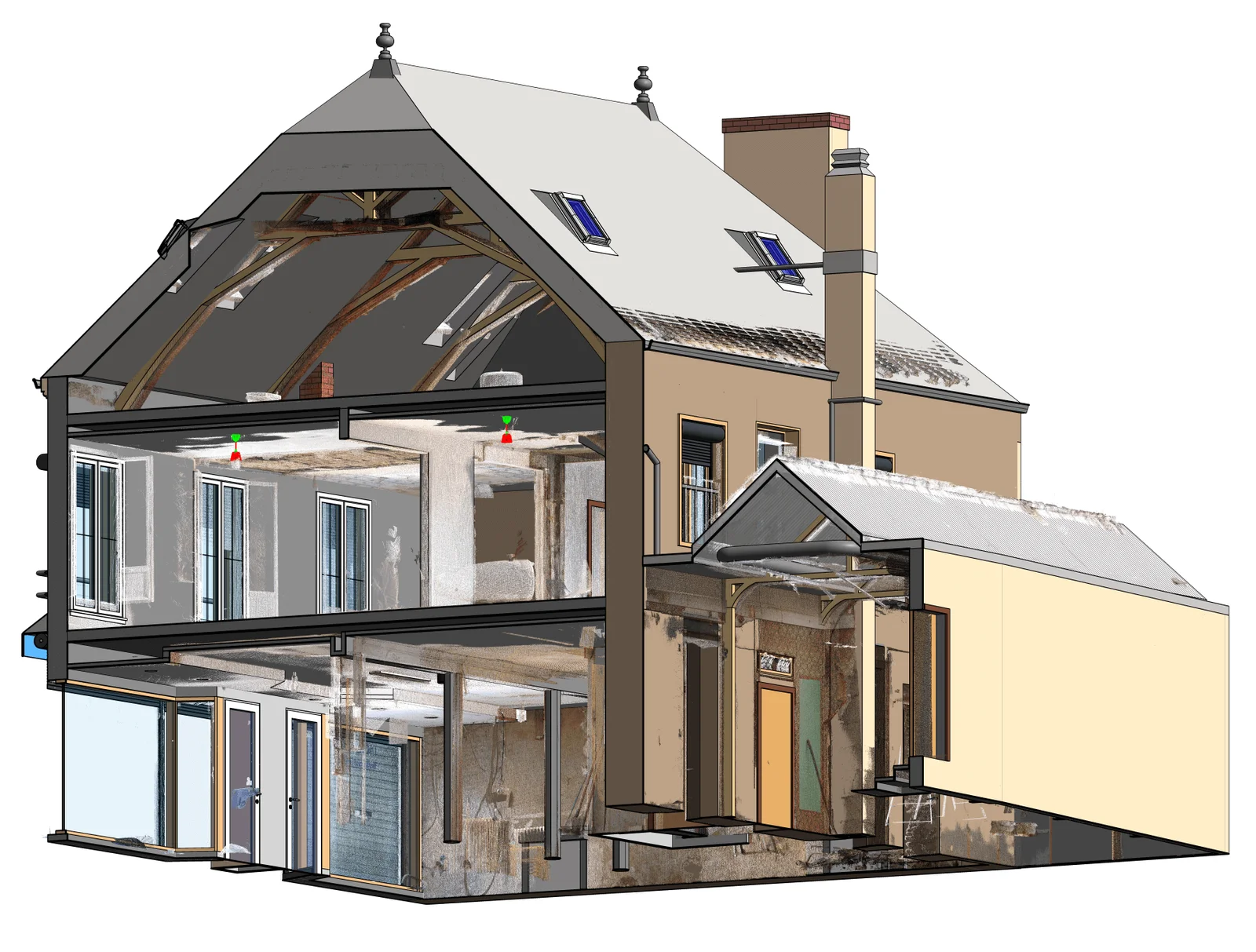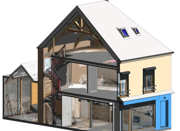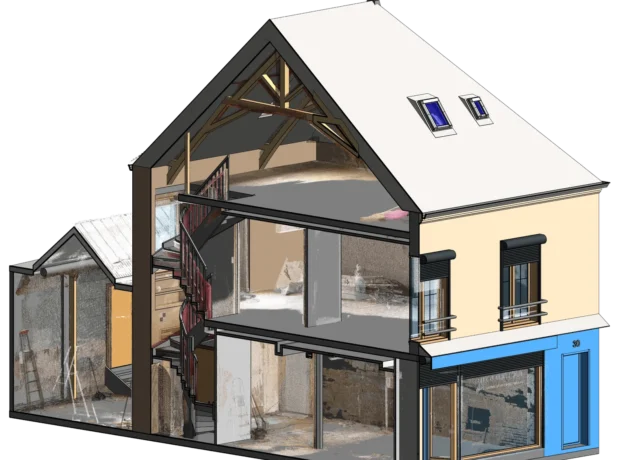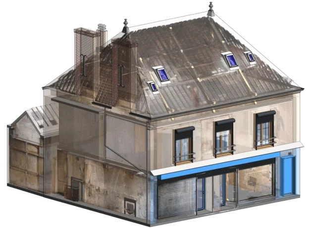 To conclude, this renovation project successfully utilized interior scan data and exterior images to create a detailed and integrated 3D model of a small commercial unit in France. Despite the challenges posed by exterior modeling from images and data integration, the resulting model provides the client with a valuable resource for redesigning the building, with a focus on accuracy, realism, and facility management integration. This project represents a significant step towards the client’s renovation goals, offering a comprehensive view of the building’s current state and its potential future.