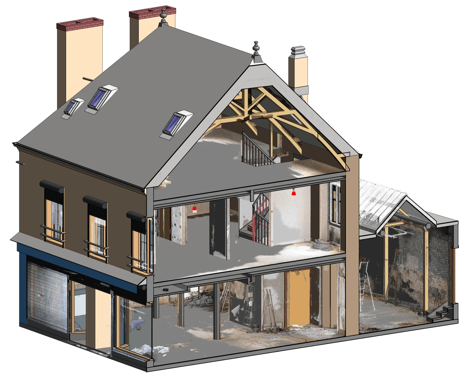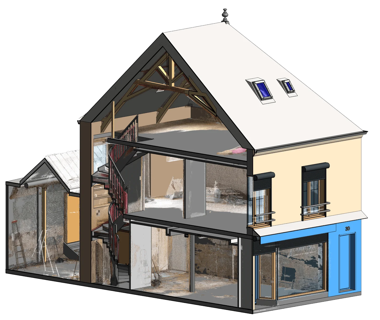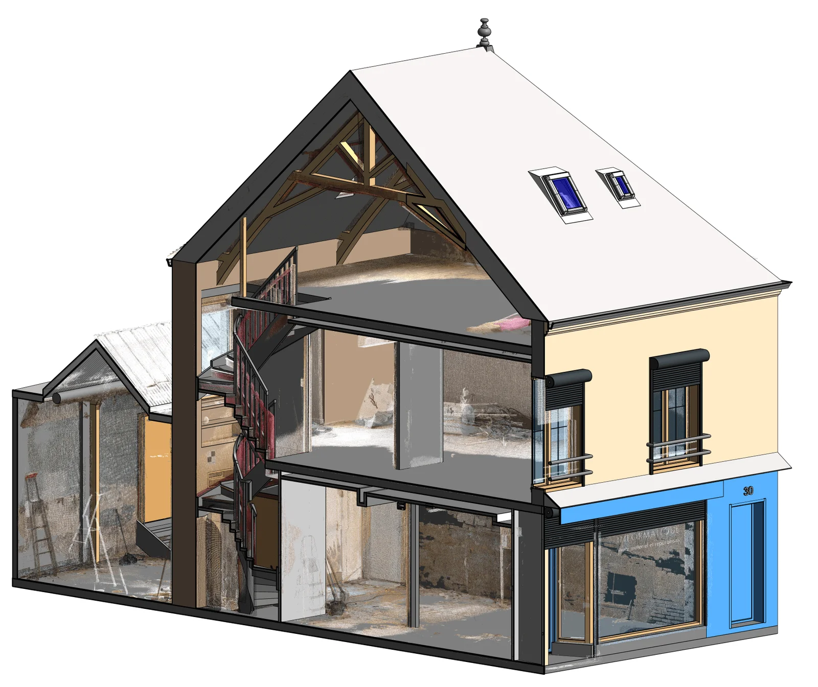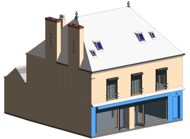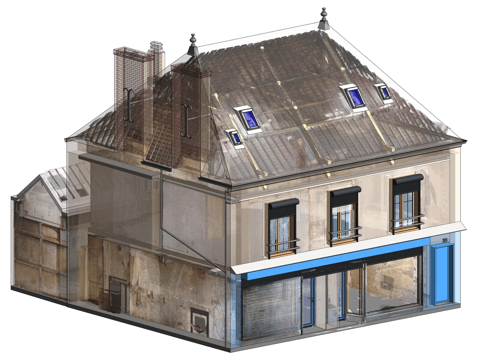 The main objective of this project was to create an integrated 3D model of a small commercial unit in France, incorporating both interior and exterior elements. This model would serve as a foundational tool for the client’s renovation planning, allowing for a visual representation of the building’s current state while ensuring consistency with the exterior appearance.